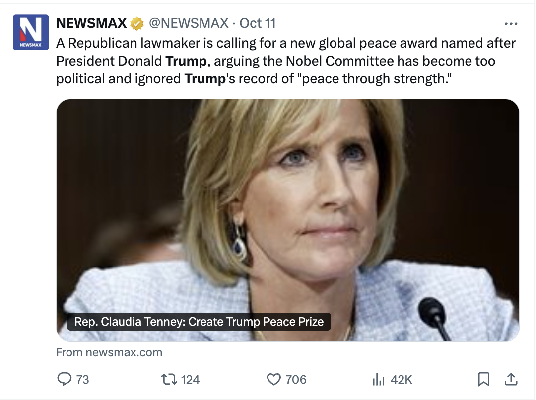 “The Nobel Peace Prize once stood for strength, integrity, and moral clarity,” Tenney wrote. “Today, it too often rewards symbolism and politics instead of real achievement.”