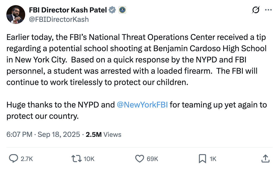 The boy had a loaded gun in his possession when police took him into custody, Patel explained in a post on X. He credited the National Threat Operations Center with acting quickly to prevent a tragedy at Benjamin Cardozo High School in New York City.
