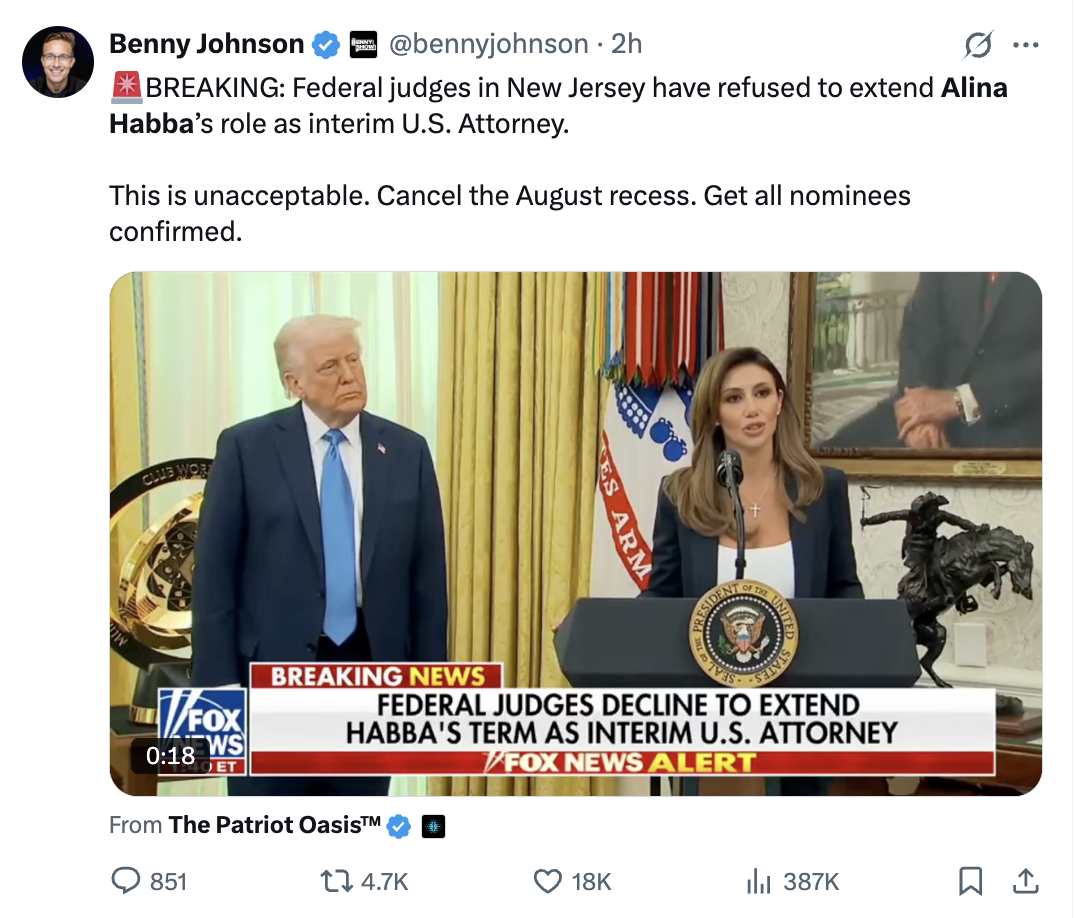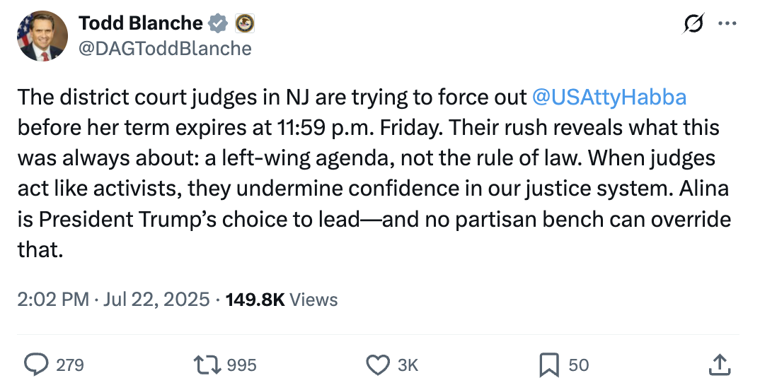 Deputy U.S. Attorney General Todd Blanche wrote on X shortly before the decision, “The district court judges in NJ are trying to force out @USAttyHabba before her term expires at 11:59 p.m. Friday.”