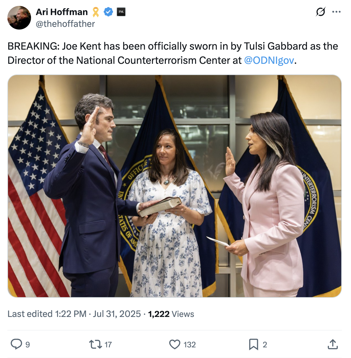 “It’s a profound honor to be confirmed as NCTC Director at this pivotal moment,” said NCTC Director Kent. “I’ve spent over two decades on the front lines of the counterterrorism fight, from Fallujah to Yemen, losing my wife Shannon and countless brothers-in-arms to this war. Their sacrifices drive me to lead with relentless focus to keep Americans safe. There’s no better time to take on this mission, and I’m deeply grateful to President Trump and DNI Gabbard for entrusting me to lead NCTC in defeating the threats we face.”