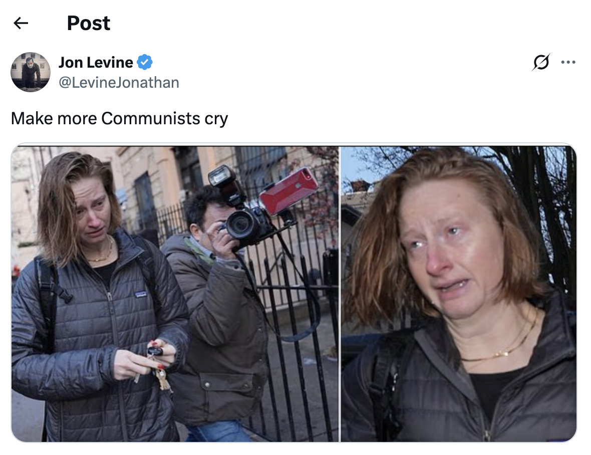 Jon Levine, a reporter for the Washington Free Beacon, posted pictures of Weaver crying on X, with the caption, “Make more Communists cry.”