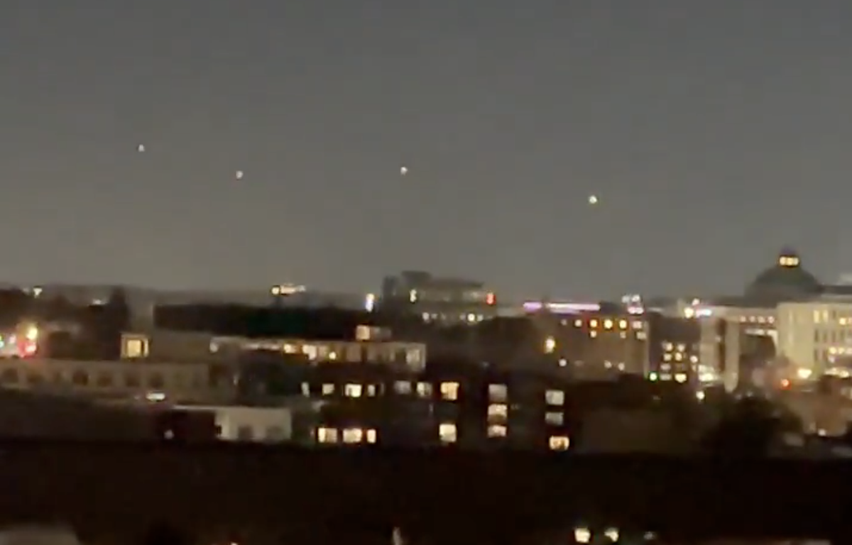 A video from farther away appears to show the same lights. As two of them begin to separate from the group, a fifth abruptly appears out of thin air. The video sparked a “UFO panic” as users rushed to make their best guesses about what could explain the phenomenon. “It’s already happening,” one user wrote. A viewer who claims to work in the area suspected it was nothing more than air travel. “These look like flights lined up for Reagan National (DCA) plus a possibly a helicopter,” they wrote, causing another to reply, “Planes and helicopters don’t just materialize.”