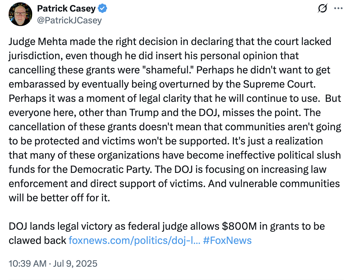 “Defendants’ rescinding of these awards is shameful. It is likely to harm communities and individuals vulnerable to crime and violence,” Mehta wrote. “But displeasure and sympathy are not enough in a court of law.”