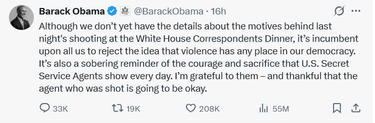 Hours later, Obama posted on X: “Although we don’t yet have the details about the motives behind last night’s shooting at the White House Correspondents’ Dinner, it’s incumbent upon us all to reject the idea that violence has any place in our democracy,” adding that he was grateful to the Secret Service and “thankful that the agent who was shot is going to be OK.”