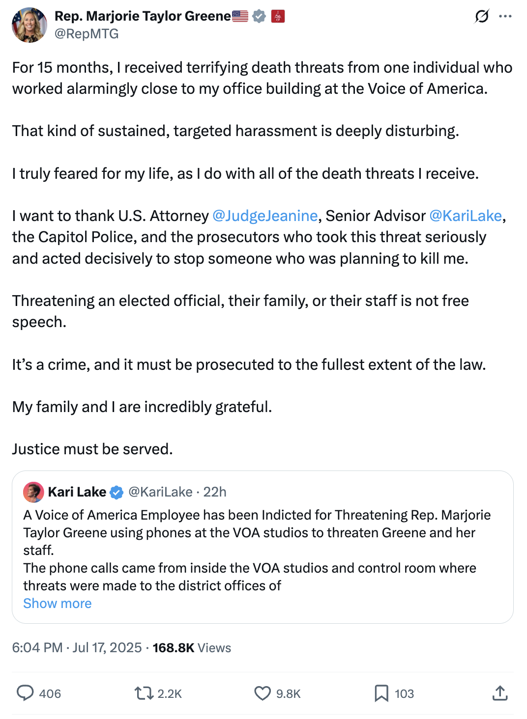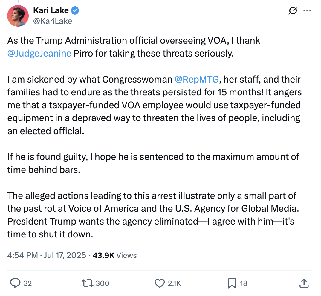 “A Voice of America Employee has been Indicted for Threatening Rep. Marjorie Taylor Greene using phones at the VOA studios to threaten Greene and her staff,” she wrote on X.