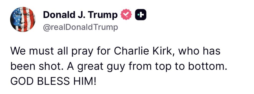 “We must all pray for Charlie Kirk, who has been shot. A great guy from top to bottom. GOD BLESS HIM!” the president posted on Truth Social.