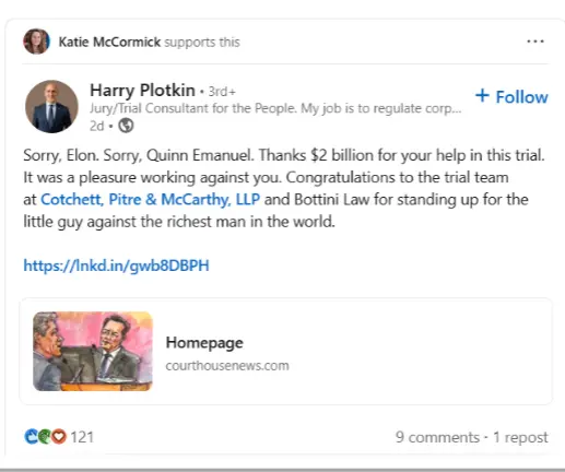 “Thanks $2 billion for your help in this trial. It was a pleasure working against you. Congratulations to the trial team at Cotchett, Pitre & McCarthy, LLP and Bottini Law for standing up for the little guy against the richest man in the world.”