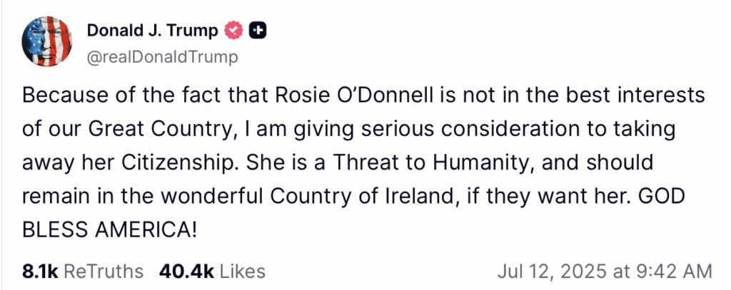 “Because of the fact that Rosie O’Donnell is not in the best interests of our Great Country, I am giving serious consideration to taking away her Citizenship,” the president posted on Truth Social. “She is a Threat to Humanity, and should remain in the wonderful Country of Ireland, if they want her,” Trump continued, concluding the post with, “GOD BLESS AMERICA!”