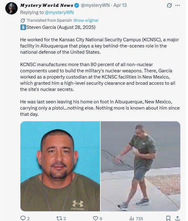 Garcia’s disappearance is being cited as the 10th case in recent years involving someone connected to U.S. space or nuclear work who has died or gone missing, according to the report. It also tracks with at least three other disappearances described as similar: individuals leaving home on foot, with personal items left behind, and then vanishing.