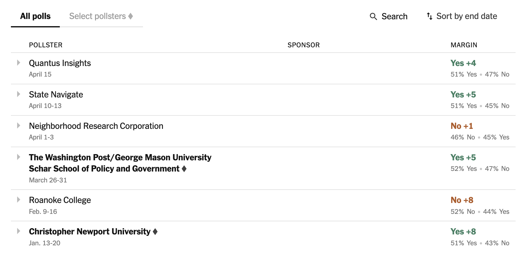 Polling in the run-up to the Virginia referendum was uneven. Some surveys showed modest support for the measure. Others suggested it was in danger of falling short. An earlier poll even had opponents with a clear lead, underscoring how volatile the electorate looked heading into April.