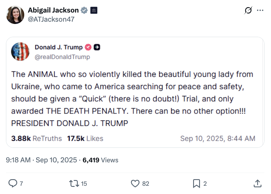 “The ANIMAL who so violently killed the beautiful young lady from Ukraine, who came to America searching for peace and safety, should be given a ‘Quick’ (there is no doubt!) Trial, and only awarded THE DEATH PENALTY,” Trump posted. “There can be no other option!”