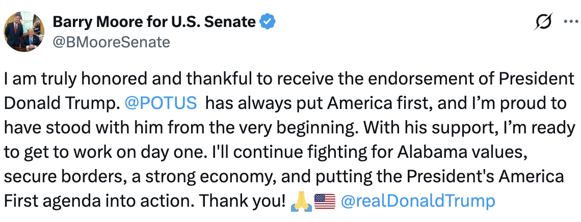 “President Trump has always put America first, and I’m proud to have stood with him from the very beginning,” Moore added. “With his support, I’m ready to get to work on day one. I’ll continue fighting for Alabama values, secure borders, a strong economy, and putting the President’s America First agenda into action.”