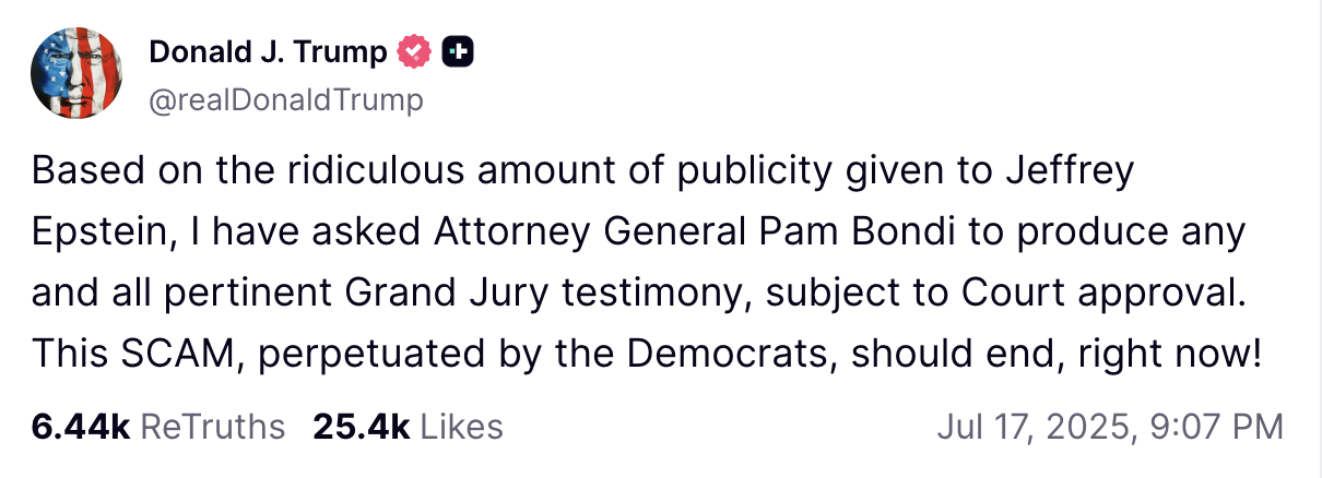 Citing “the ridiculous amount of publicity given to Jeffrey Epstein,” Trump declared he has “asked Attorney General Pam Bondi to produce any and all pertinent Grand Jury testimony, subject to Court approval.”