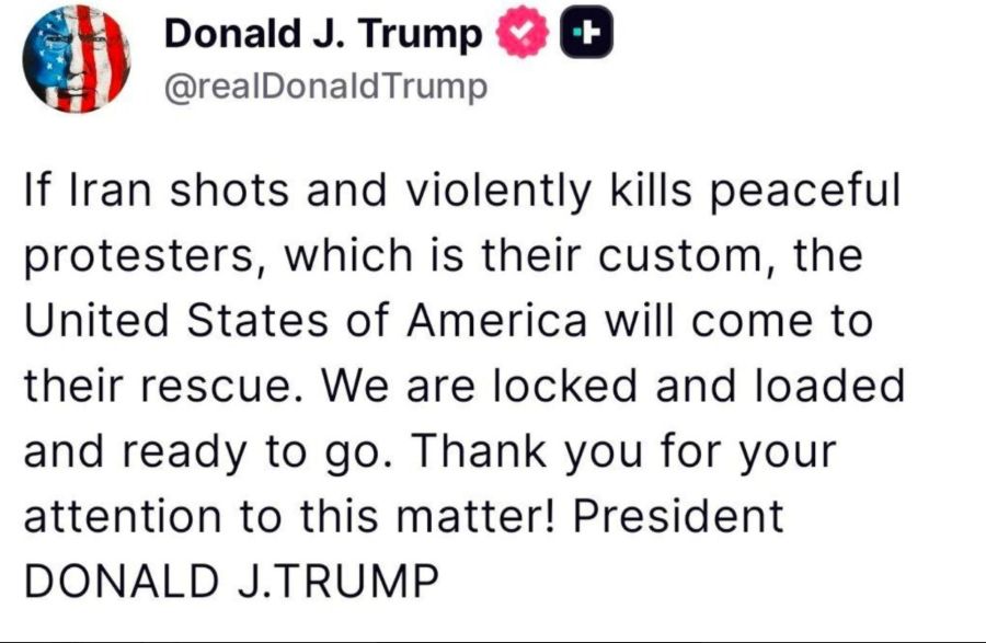 If Iran “kills peaceful protesters, which is their custom, the United States of America will come to their rescue. We are locked and loaded and ready to go,” Trump wrote in an overnight post on Truth Social.