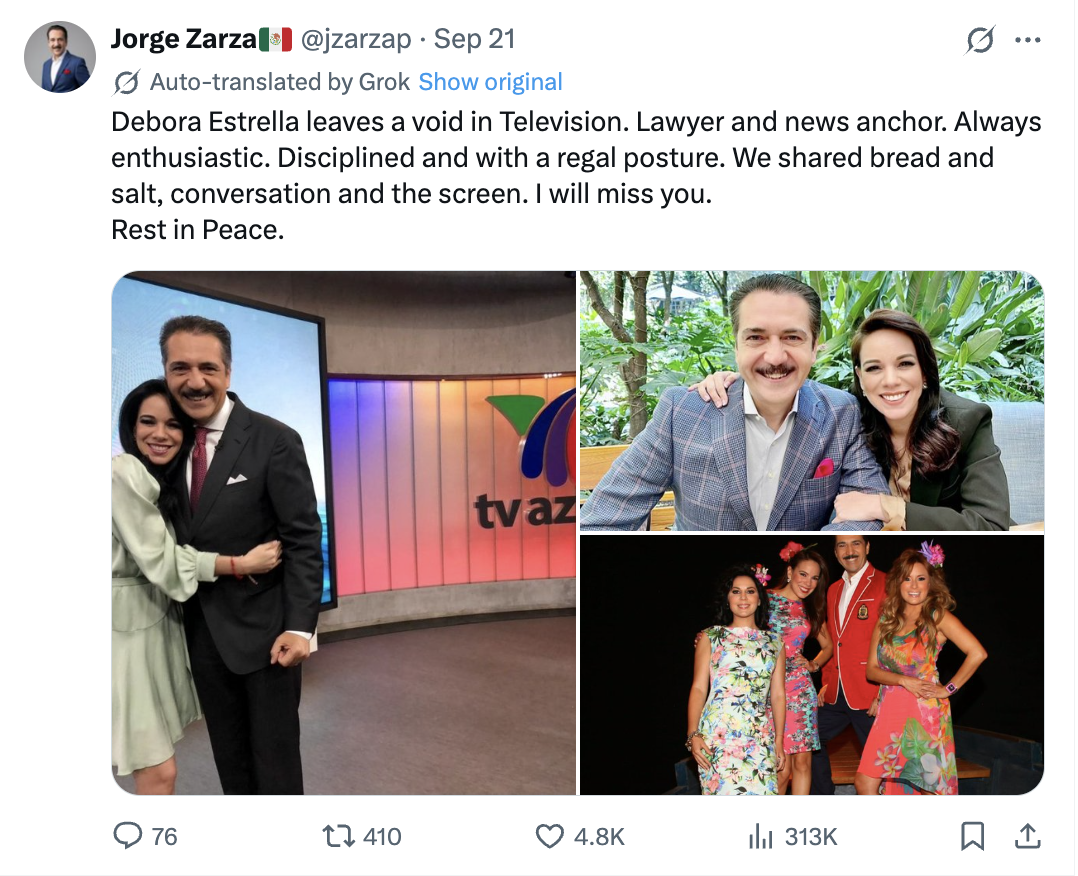 TV Azteca anchor Jorge Zarza wrote, “Debora Estrella leaves a void in Television. Lawyer and news anchor. Always enthusiastic. Disciplined and with a regal posture. We shared bread and salt, conversation and the screen. I will miss you. Rest in Peace.”