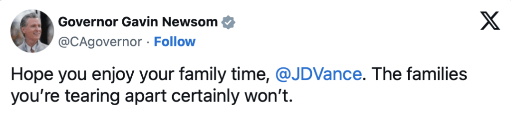 California Governor Gavin Newsom joined them by tweeting out an attack on the family to his 2.3 million X followers. “Hope you enjoy your family time, @JDVance. The families you’re tearing apart certainly won’t,” Newsom posted from his official government page.