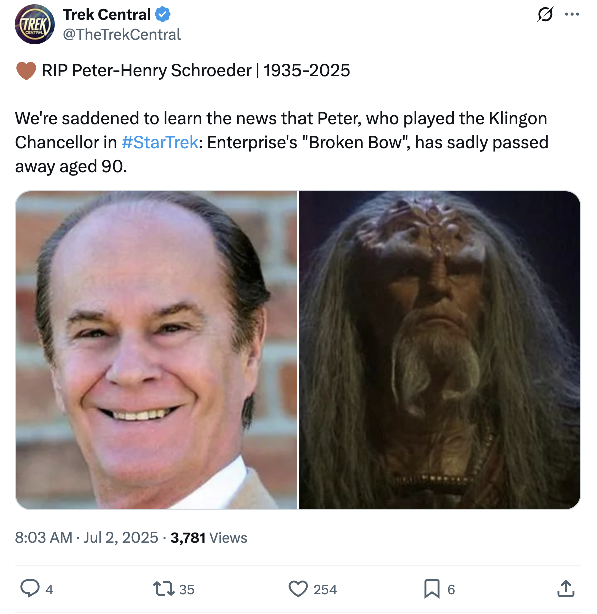 He portrayed the Klingon Chancellor in the first episode of “Star Trek: Enterprise,” which aired from 2001 to 2005, a time of transition for a series that dates back to 1966. Although the four-season show received mixed reviews, Schroeder’s strength in his debut performance kept the “Star Trek” fandom alive well into the 21st century, paving the way for box office hits like 2009’s “Star Trek” starring Chris Pine.