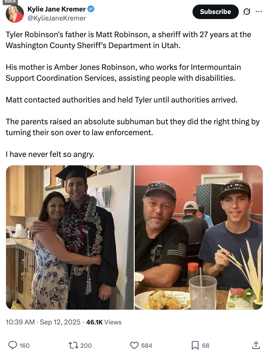 Today, Matthew Robinson, the suspect’s father, works in construction after previously spending 27 years as an officer with his hometown police department in Washington, Utah. Tyler’s mother, Amber, is a healthcare worker whose company contracts with the state to provide care for residents with disabilities.