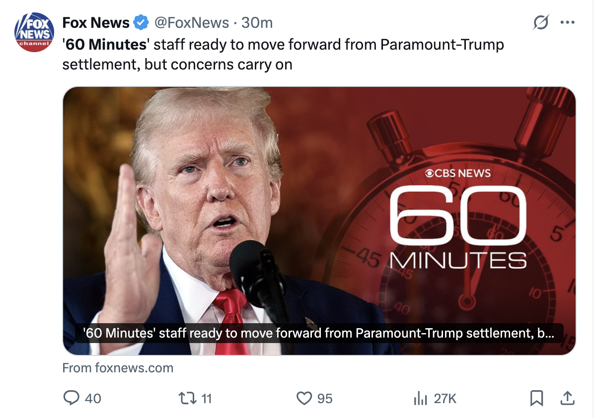 Although ready to move forward, producers of the storied news program are still unsettled by Paramount’s decision to pay Trump $16 million to settle a suit alleging that “60 Minutes” deceptively edited its interview last year with former Vice President Kamala Harris. Last week the Federal Communications Commission and its pro-Trump chair, Brendan Carr, allowed Paramount to merge with Skydance, an $8 billion deal that critics allege wouldn’t have happened without the personal payment to Trump.