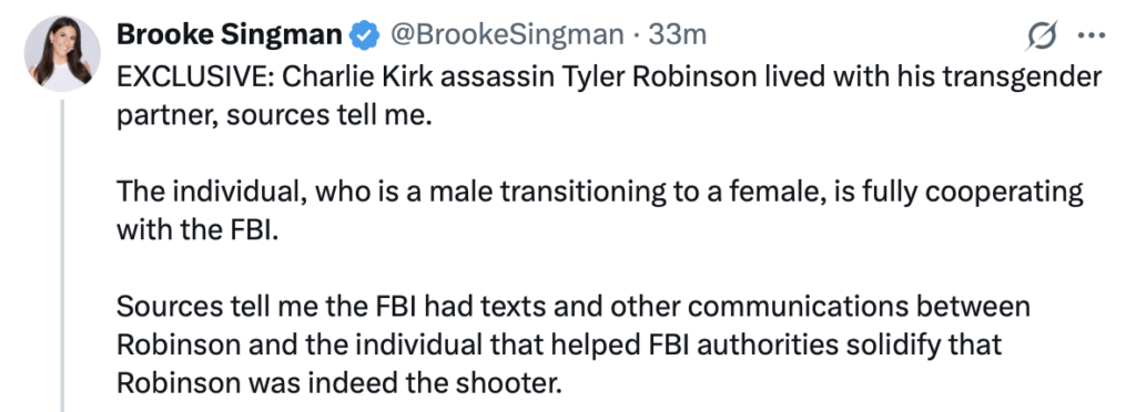 Singman noted that just before Kirk was shot, he was asked a question about the rise in violence carried out by transgender-identifying individuals. “Too many,” he said just seconds before the shot rang out.