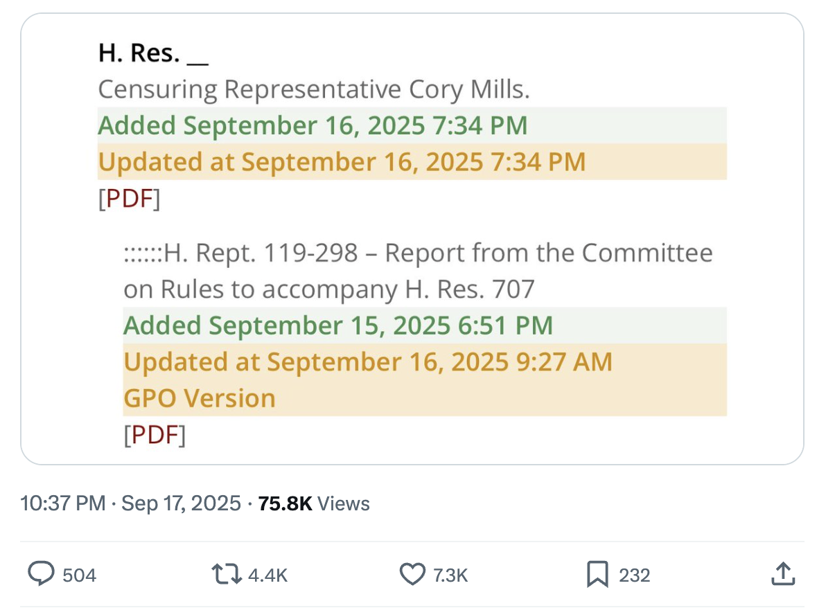 Rep. Cory Mills (R-FL), who in recent months has been accused of domestic abuse, stolen valor, and financial misconduct, was part of an agreement with Democrats to vote to table a resolution censuring Rep. Ilhan Omar (D-MN) for denouncing Republicans’ response to Charlie Kirk’s death. Democrats presented the GOP majority with their own deal: kill Omar’s censure, and we’ll withdraw ours.