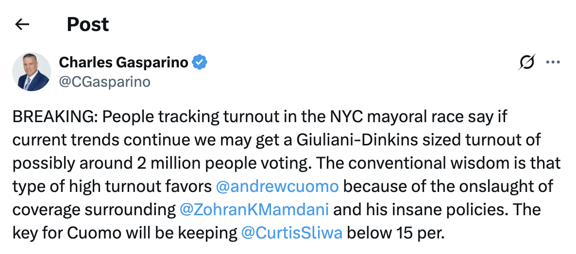 If turnout truly balloons toward the 2 million mark in the mayoral contest, it could reshape the race in unpredictable ways. As Gasparino notes, high turnout may lean toward Andrew Cuomo — provided his campaign keeps his opponent below the 15 percent threshold.