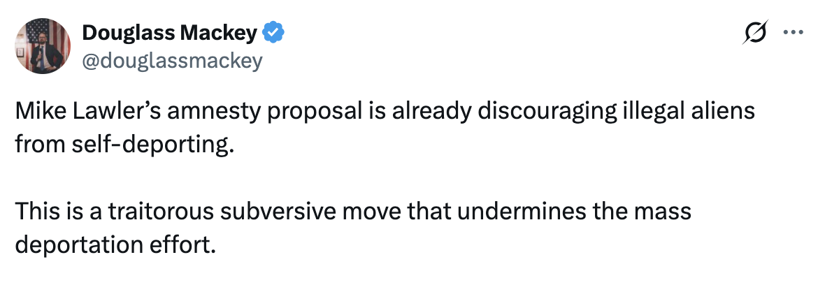 Douglass Mackey wrote, “Mike Lawler’s amnesty proposal is already discouraging illegal aliens from self-deporting.”