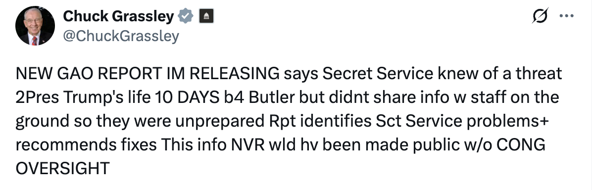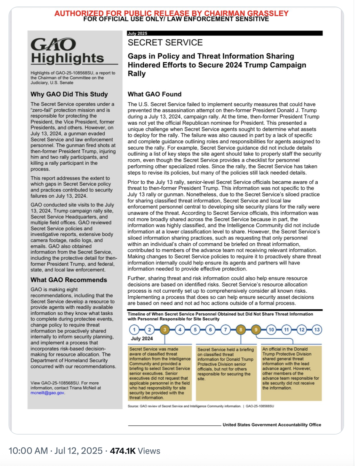 Elsewhere, GAO officials wrote about speaking with the Special Agent in Charge at the agency’s Pennsylvania office who said that, had they known about the threat against Trump, they would have “requested additional assets, such as ballistic glass, additional drone mitigation, and a full counter sniper advance team, among other assets.”