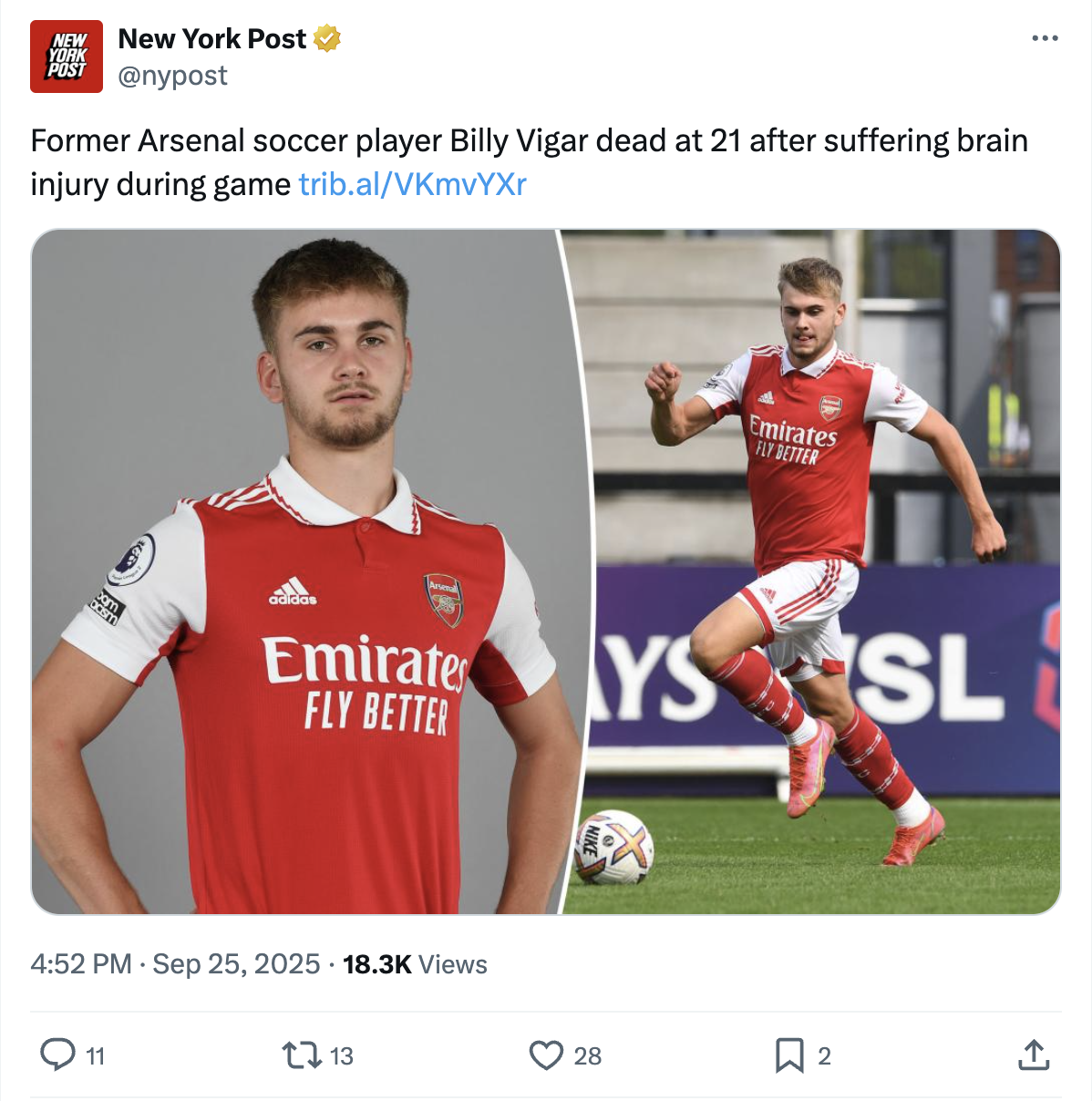 “Everyone at Arsenal is devastated by the shocking news that former academy graduate Billy Vigar has passed away,” Arsenal said in a statement. The club described him as a “powerful and versatile forward.