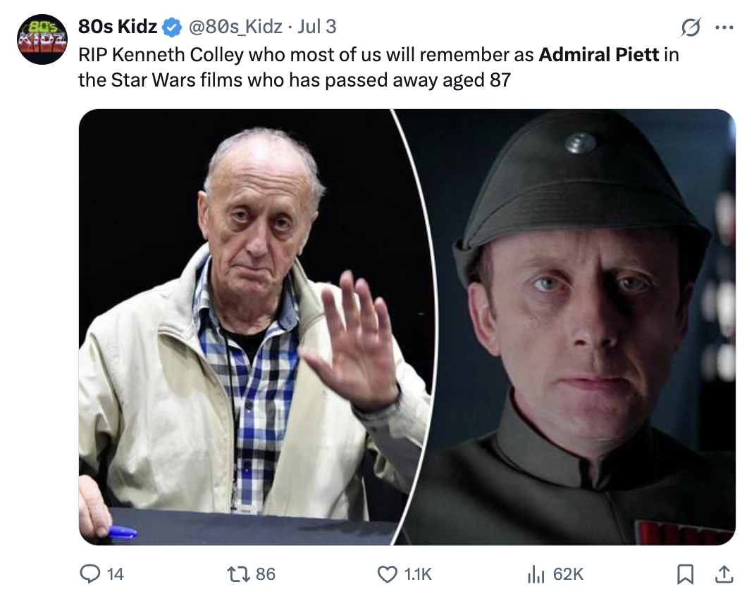 Colley became a fan favorite for his stone-cold portrayal of Admiral Firmus Piett, a key deputy to Darth Vader in “The Empire Strikes Back.” The British actor found minor fame after appearing in the 1980 film and returning three years later for “Return of the Jedi.”