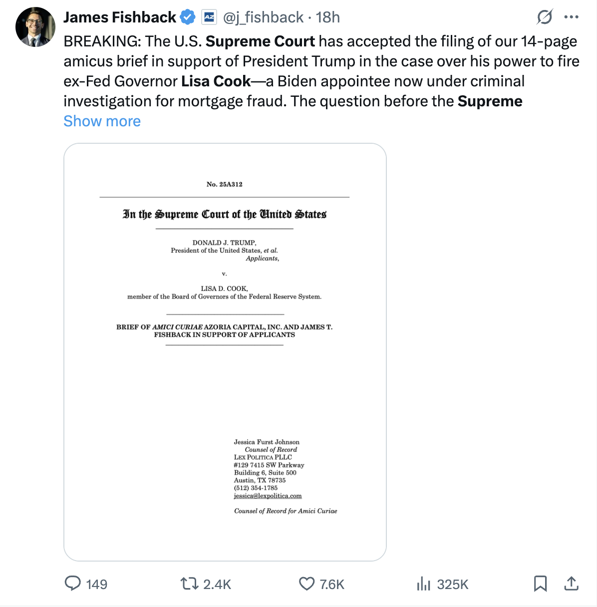 Cook, who was just three years into a 14-year term, filed suit after Trump attempted to fire her for cause, citing allegations of mortgage fraud originating from a federal mortgage authority run by Bill Pulte, a fierce ally of the president who has targeted other Democrats with similar claims.