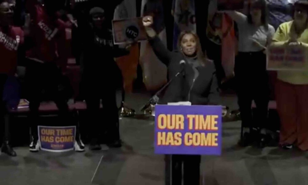 New York Attorney General Letitia James strode defiantly to the center stage of a rally for socialist mayoral candidate Zohran Mamdani on Monday night, raising her...