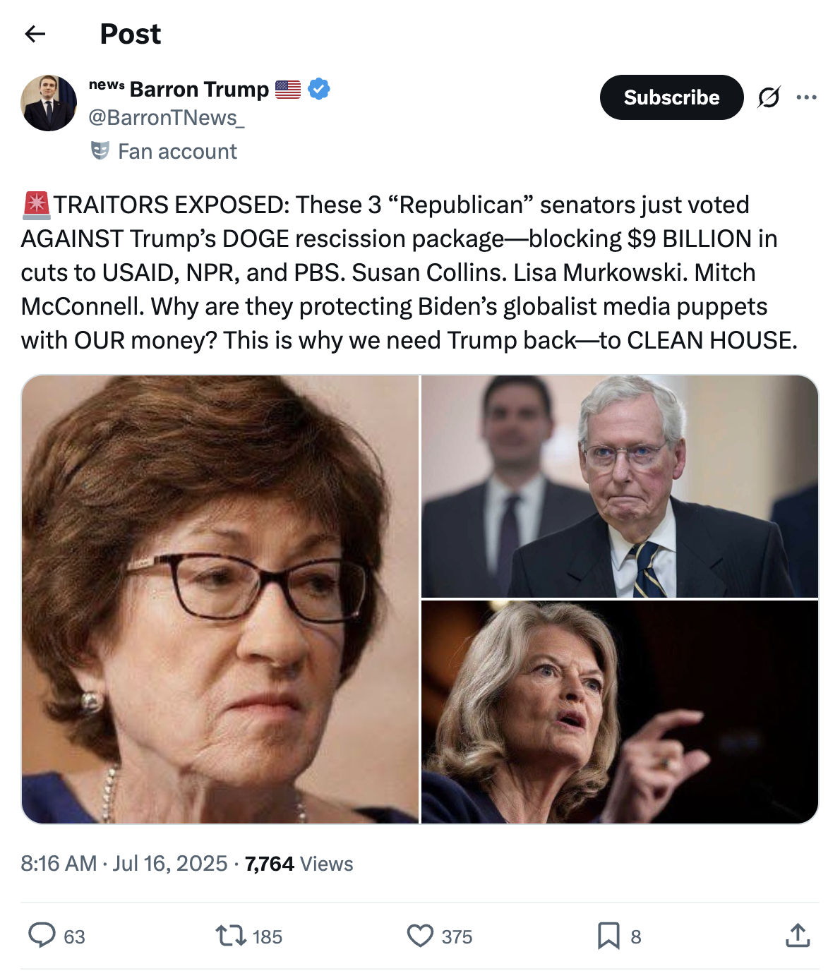 Joining the Maine Republican in opposition was Sen. Lisa Murkowski (R-AK), fresh off receiving significant carveouts in return for voting for President Trump’s One Big, Beautiful Bill. Sen. Mitch McConnell (R-KY), who is not running for reelection, also voted against defunding both media outlets.