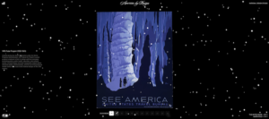 One featured image displays a stylized travel poster rendered in deep blues, depicting figures standing inside a massive cave formation. The artwork was originally used to promote U.S. parks and travel, underscoring how federal art initiatives once played a central role in encouraging national tourism and civic pride.
