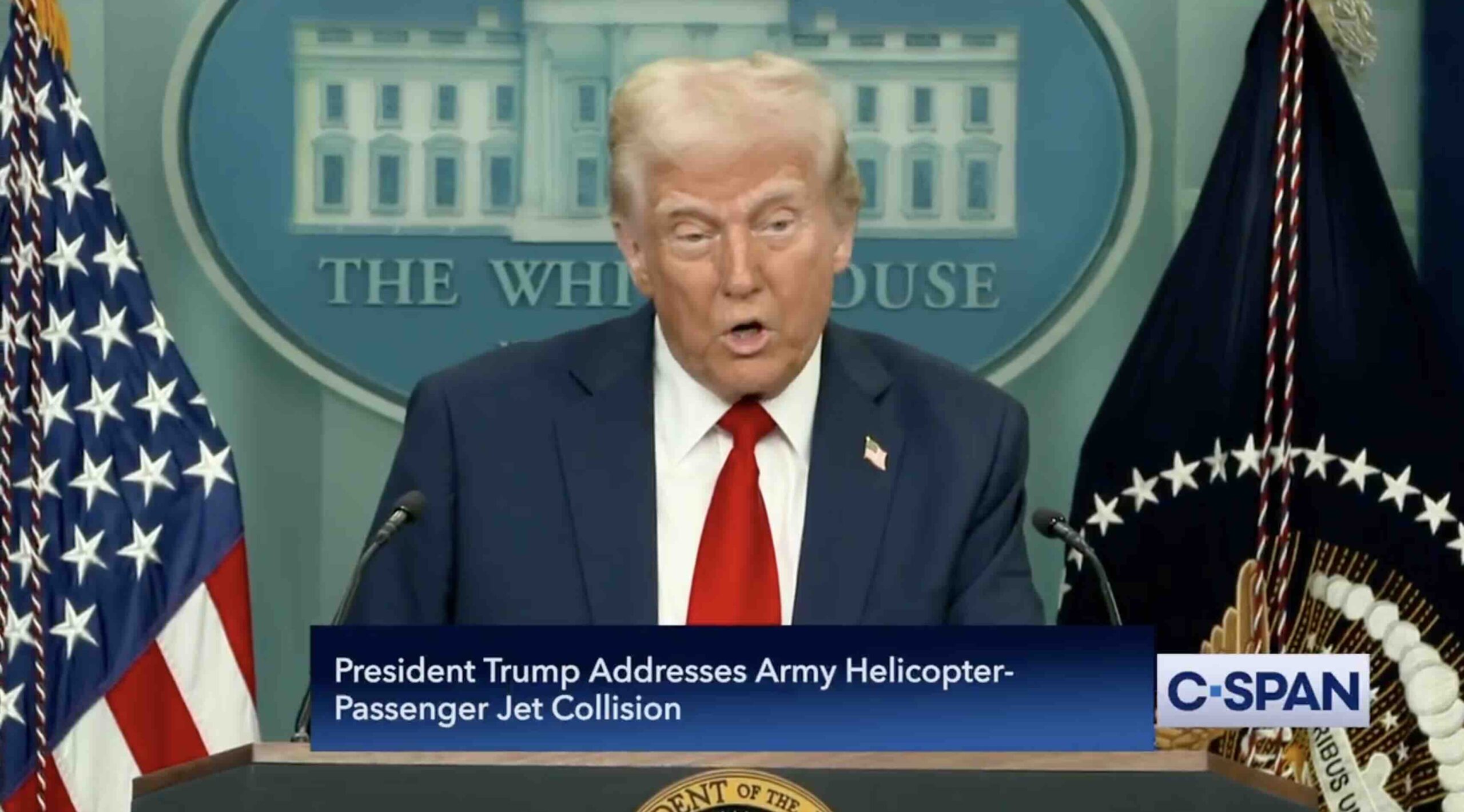 From the White House Briefing Room podium, the Republican looked on gravely as he informed members of the media about updates he received overnight and into Thursday morning. His remarks came about 13 hours after American Airlines flight 5342 collided with a Black Hawk helicopter on its descent to Reagan National Airport.