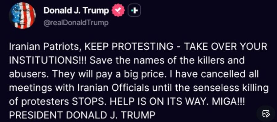 “Iranian Patriots, KEEP PROTESTING – TAKE OVER YOUR INSTITUTIONS!” Trump wrote on Truth Social. “Save the names of the killers and abusers. They will pay a big price.”