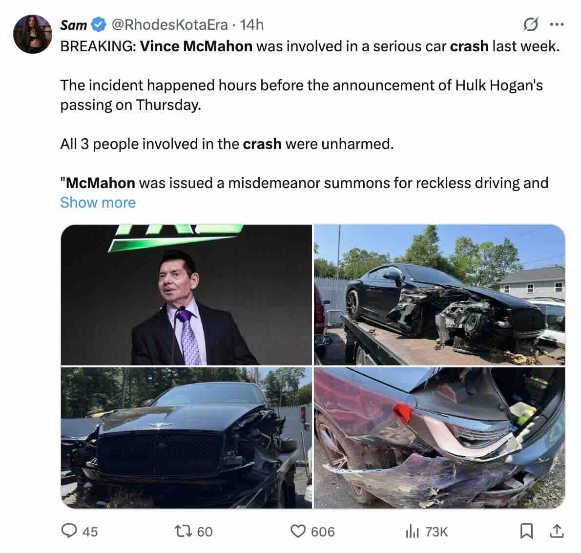 McMahon, the wrestling federation’s former CEO, was traveling near Westport, Connecticut, last week when his 2024 Bentley plowed into a 2023 BMW 430, sending it into a median guardrail. Debris from the collision flew into the opposite lane, causing damage to a Ford Fusion.