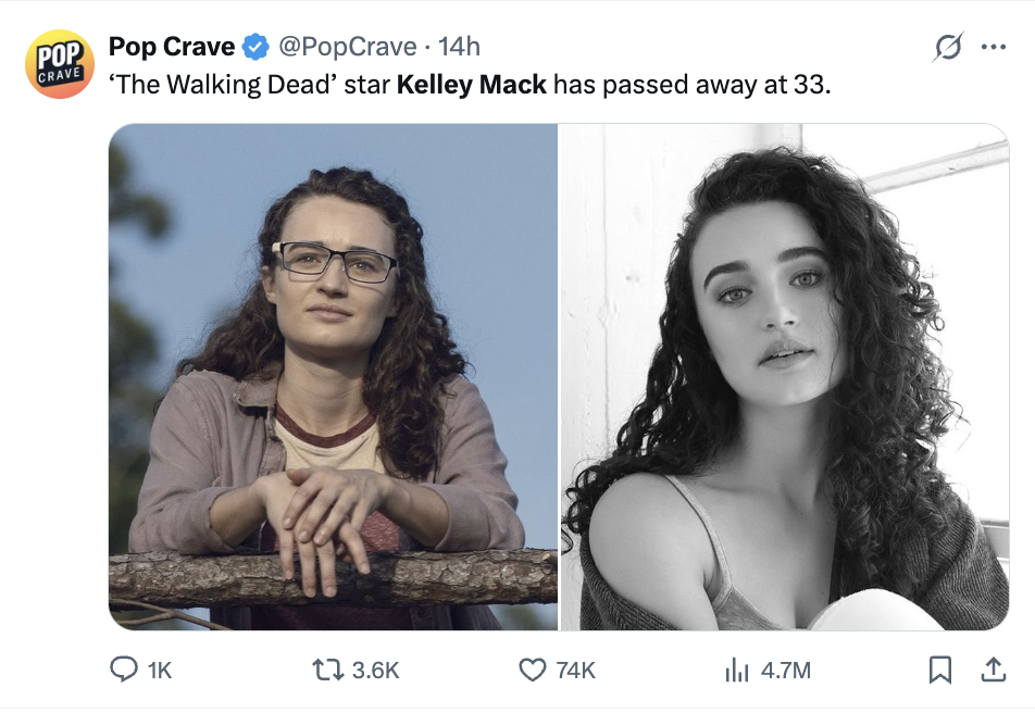 Kelley Mack, who played recurring characters on “Walking Dead” as well as the hospital drama “Chicago Med,” died Saturday in her hometown of Cincinnati, Ohio, her family confirmed. She had been battling glioma, a form of cancer that affects the central nervous system, for several years and had written publicly about her struggles on the health blog Caringbridge.