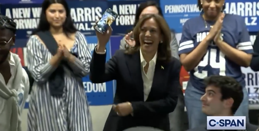 “How are you doing, have you voted already?” Harris says into the phone. “You did, thank you!” she followed up after a brief pause, drawing cheers from campaign staffers. She then flipped the phone around to show the room, only she did not appear to be on the phone with anyone. Instead, her camera app was open.