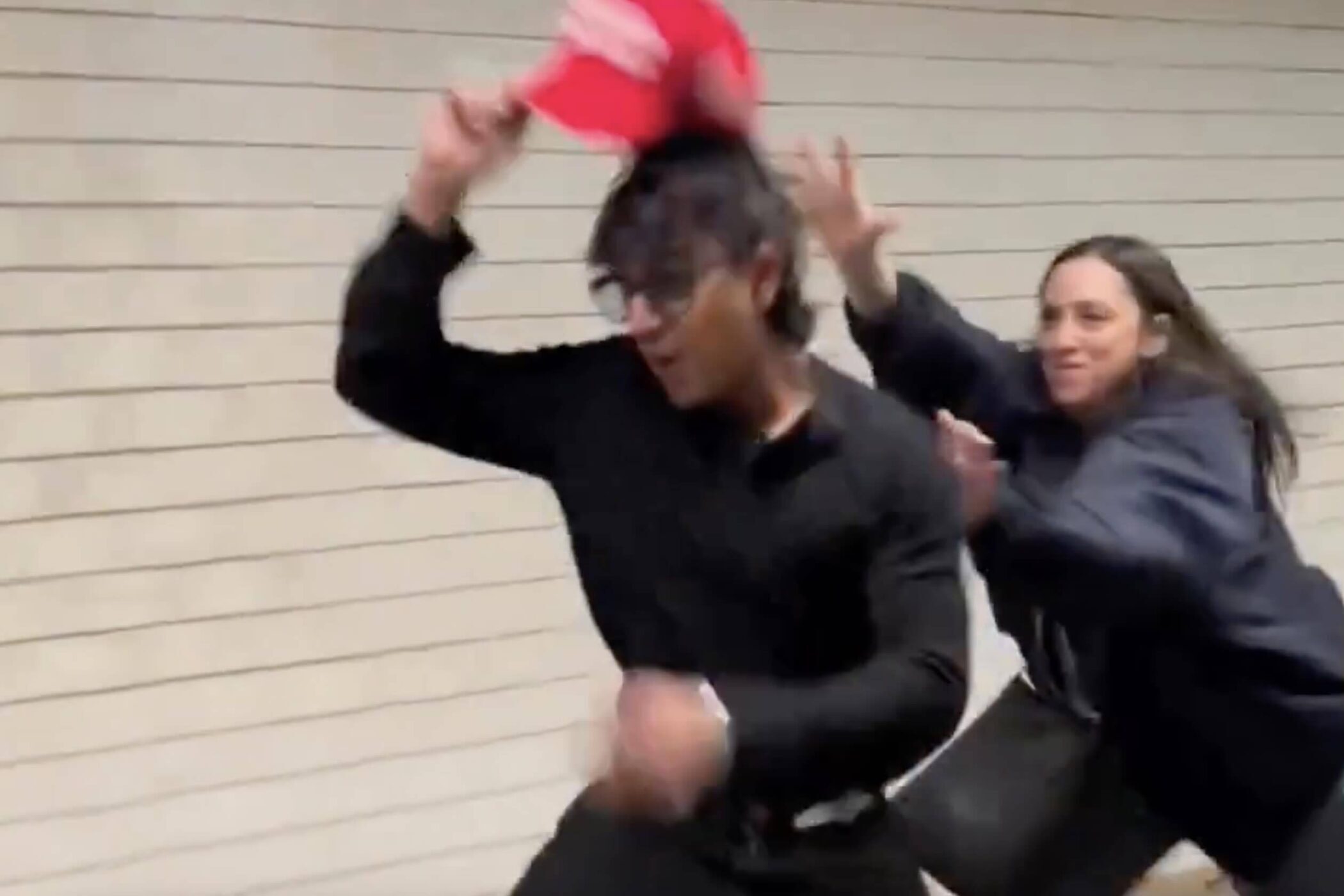 Woman falls on her face after trying to grab a MAGA hat from a man’s head in New York.