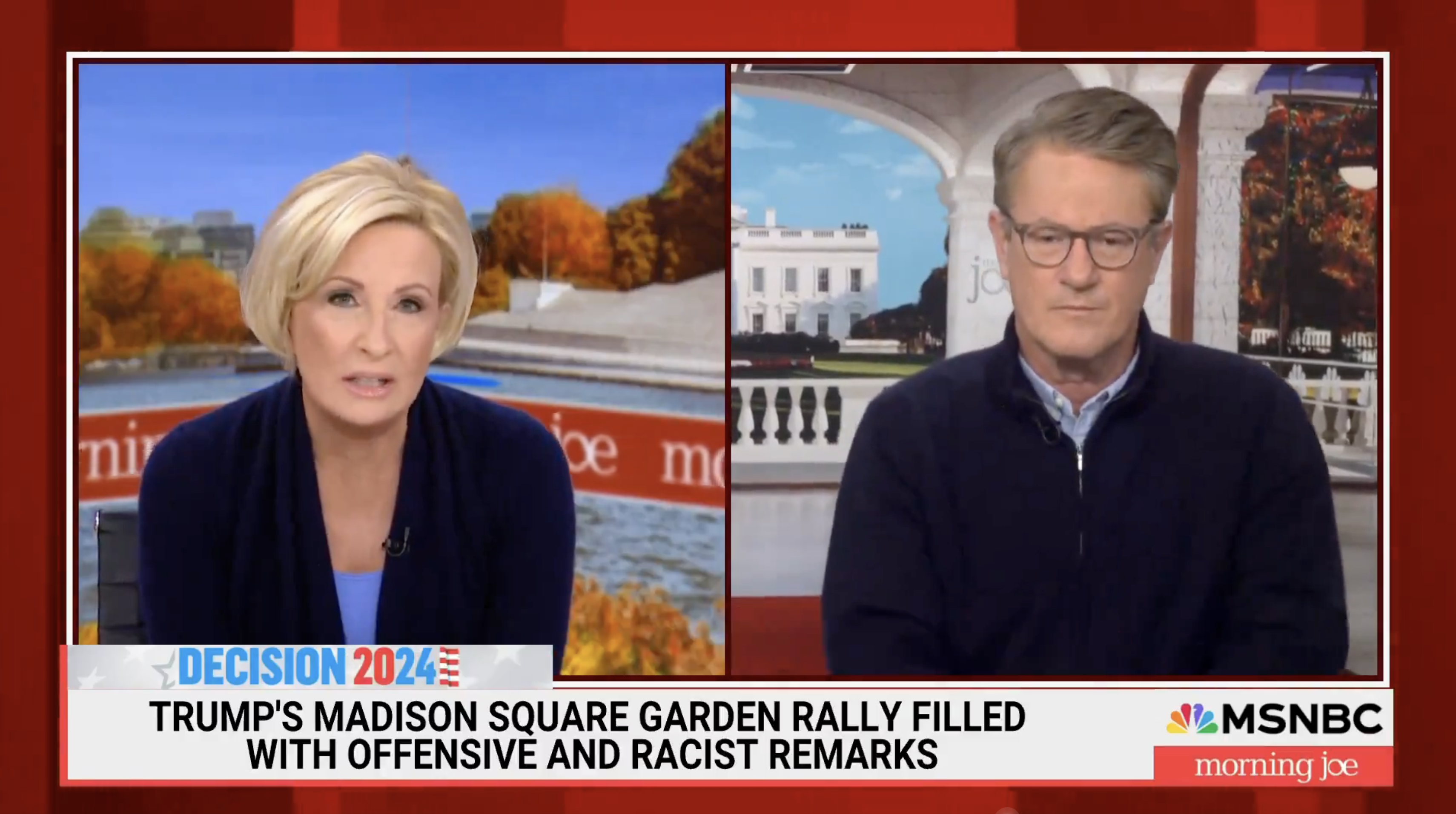 Mika Brzezinski appeared visibly shaken while downplaying scenes from Sunday Night’s expansive Manhattan rally where thousands turned out to hear from former President Donald Trump. “I think a lot of people are seeing that rally at Madison Square Garden, seeing all those people, doesn’t mean he’s going to win the race,” she told co-host Joe Scarborough and others. “But my point is it’s discouraging that so many people would gather and rally to hate, to hate speech in America. It’s discouraging, and it hurts.”