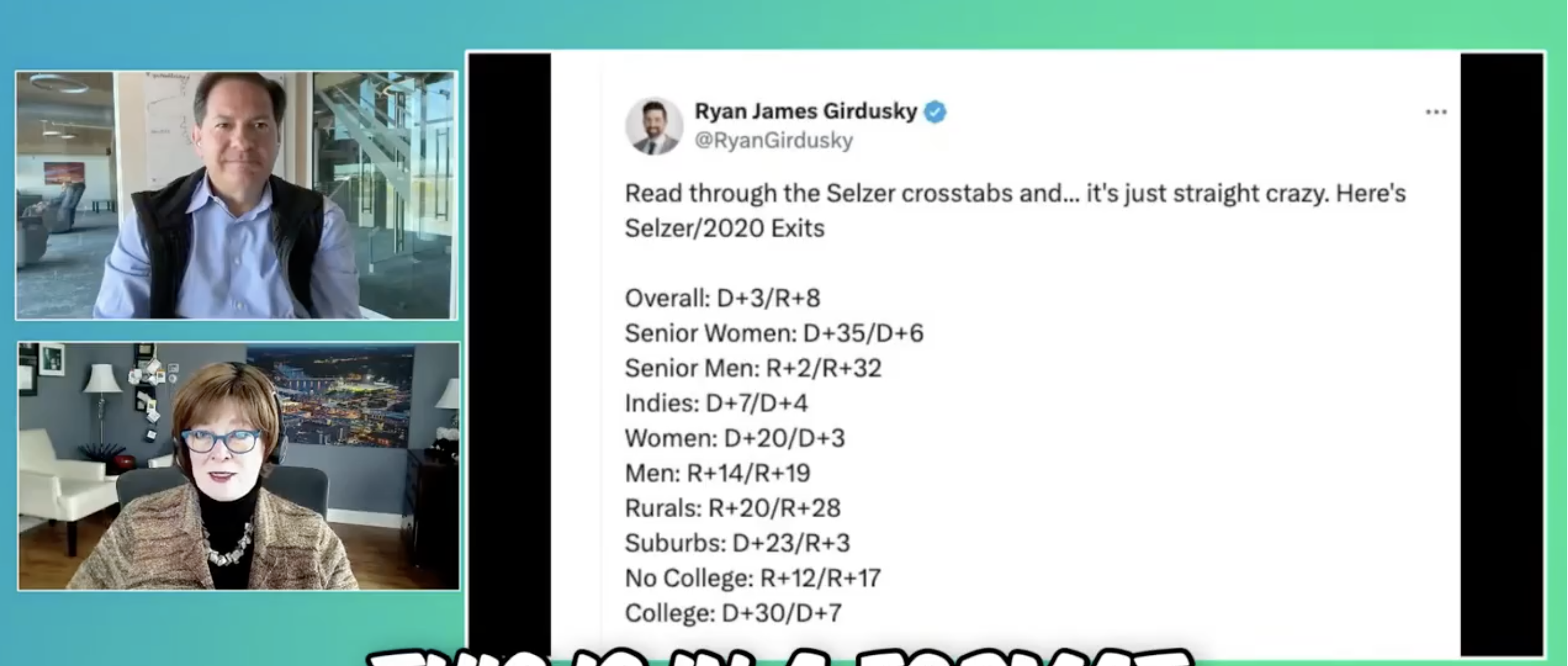 Conservative political analyst Ryan Girdusky analyzed the cross tabs of Selzer’s poll and compared them with her 2020 exit poll results, stating that the results were “straight crazy.”